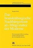 Erst seit wenigen Jahren deutet sich ein Umschwung an Mit starkem brandenburgischen Bezug ist nahezu parallel erschienen Ralf Pröve, Stadtgemeindlicher Republikanismus und die “Macht des Volkes”. Civile Ordnungsformationen und kommunale Leitbilder politischer Partizipation in deutschen Staaten vom Ende des 18. bis zur Mitte des 19. Jahrhunderts (=Veröffentlichungen des Max-Planck-Instituts für Geschichte, 159), Göttingen 2000. . Mit der Habilitationsschrift von Brigitte Meier, die selbst in den letzten Jahren eine Reihe von Veröffentlichungen zum brandenburgischen Städtewesen vorgelegt hat Vgl. etwa Brigitte Meier, Neuruppin 1700 bis 1830. Sozialgeschichte einer kurmärkischen Handwerker- und Garnisonstadt, Berlin 1993 oder Brigitte Meier, Helga Schultz (Hg.), Die Wiederkehr des Stadtbürgers. Städtereformen im europäischen Vergleich 1750-1850, Berlin 1994. , wird ein weiterer Sektor auf dem großen weißen Fleck gefüllt. Dezidiert wendet sie sich dagegen, das brandenburgische Stadtbürgertum als “Hemmschuh des Fortschritts” (S. 15) zu charakterisieren. Vielmehr hätten die Bürger “aktiv den Weg in die bürgerliche Gesellschaft” mitgestaltet (S. 18): “Demnach verhielt sich der brandenburgische Stadtbürger durchaus nicht passiv, devot, fortschrittsfeindlich und unpolitisch, sondern er nahm im Rahmen seiner Handlungsmöglichkeiten aktiv an der Gestaltung der Moderne teil”.